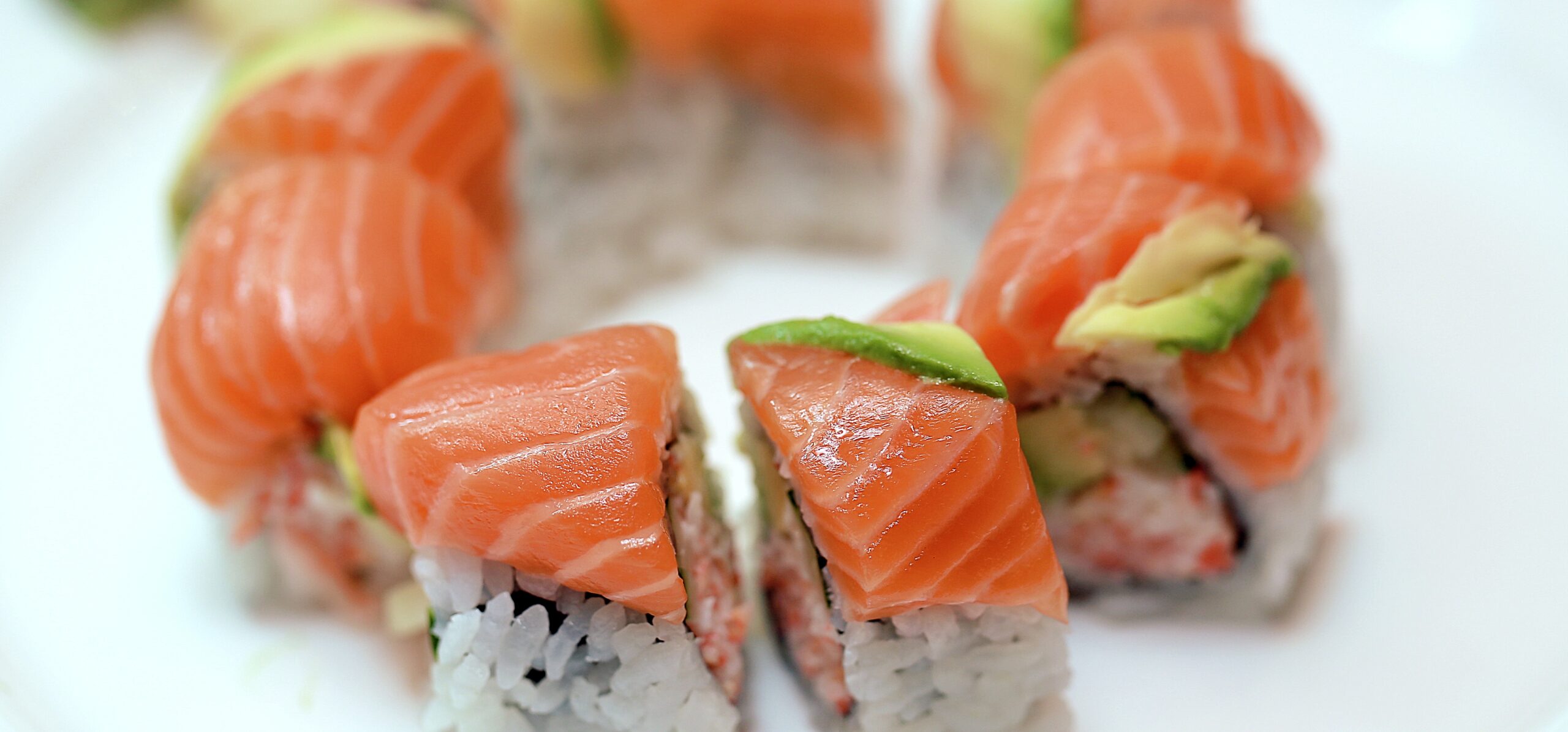 Crab meat, cucumber, avocado, fresh salmon, and avocado.