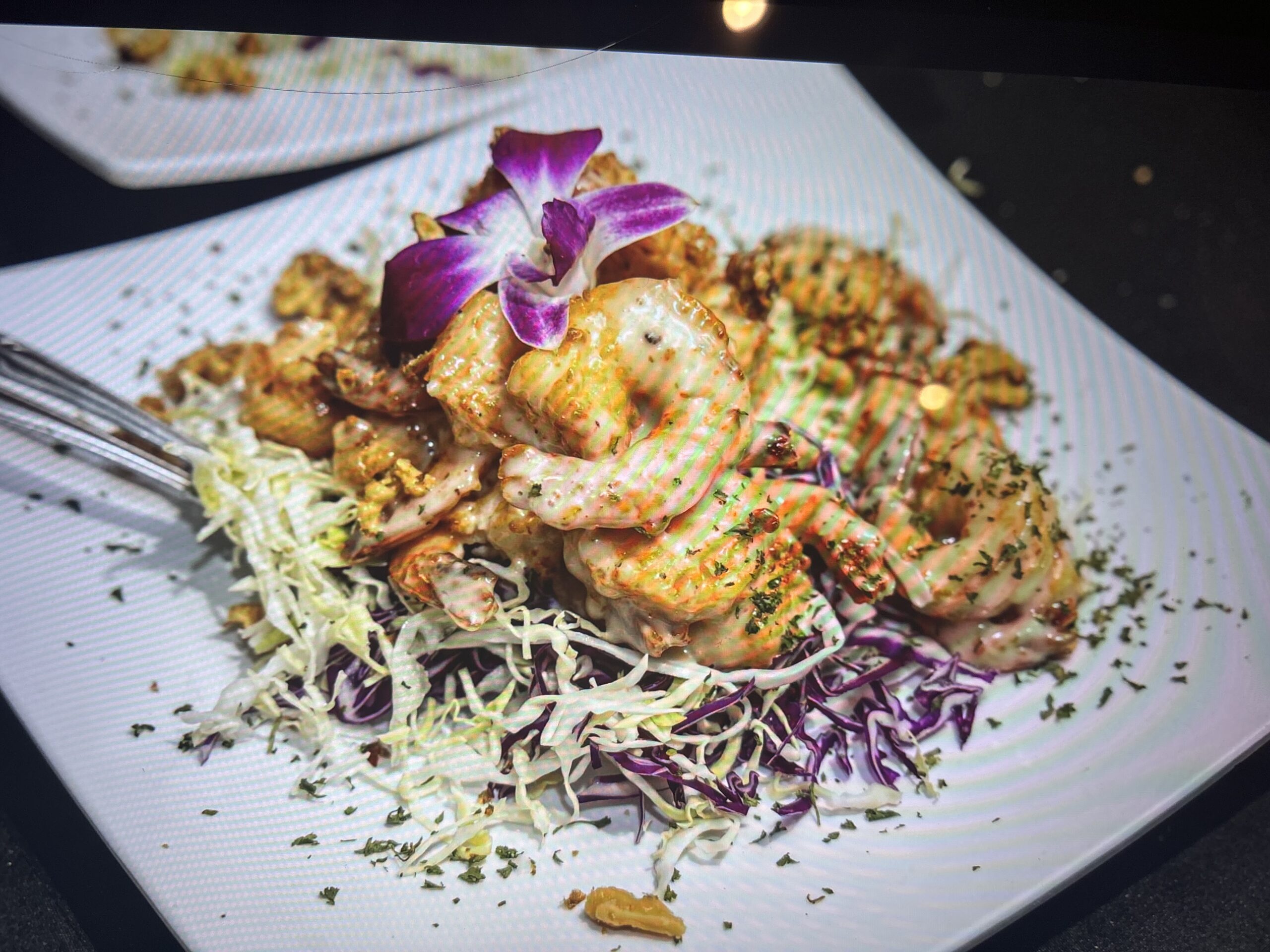Battered fried jumbo shrimp in a sweet mayo tangy sauce with seared broccoli.