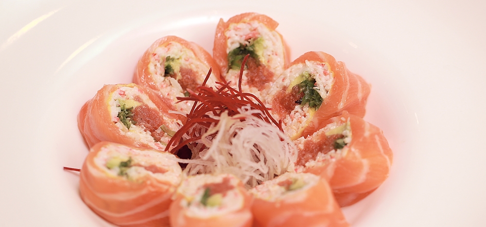 Salmon, cucumber, crab meat wrapped with tuna served with spicy ponzu sauce.