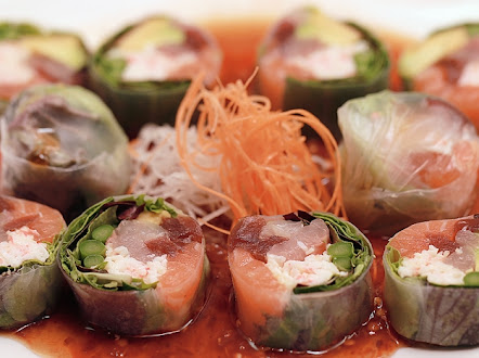 Tuna, salmon, white fish, crab meat, spring mix, avocado, cucumber wrapped in rice paper with yuzu soy base sauce.