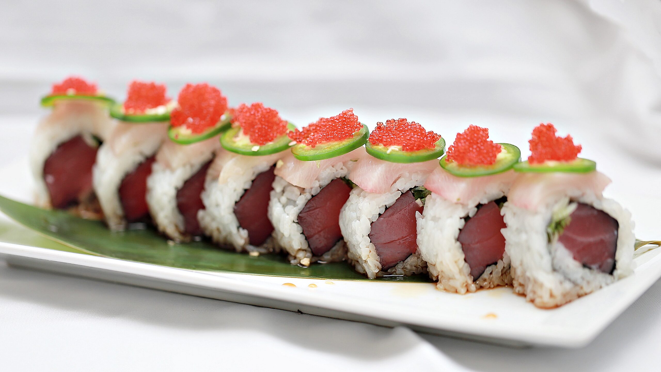 Yellowtail, cucumber wrapped with white fish topped with jalapeño, smelt roe, and sriracha.