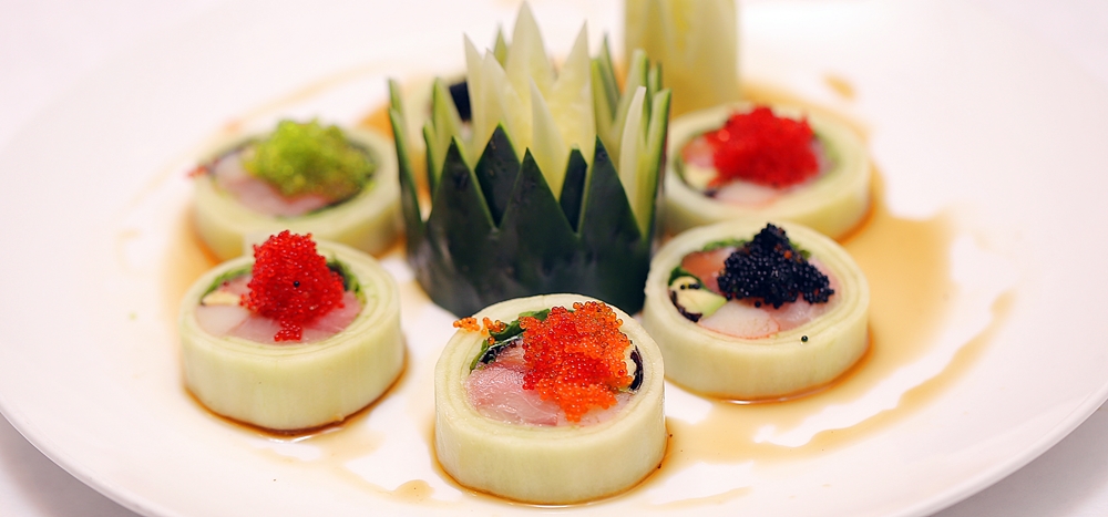 Tuna, salmon, yellowtail, crab meat wrapped in cucumber topped with masago and ponzu sauce.