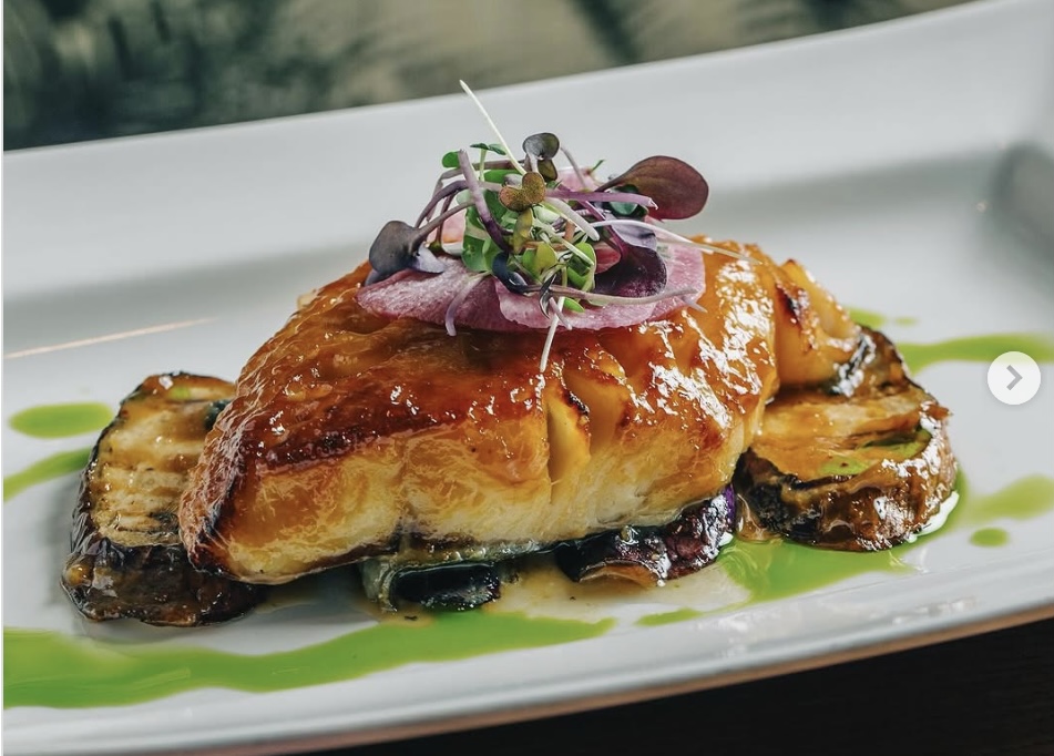 Grilled Salmon in spicy sake brown curry sauce and heavy cream milk with mushroom, broccoli.