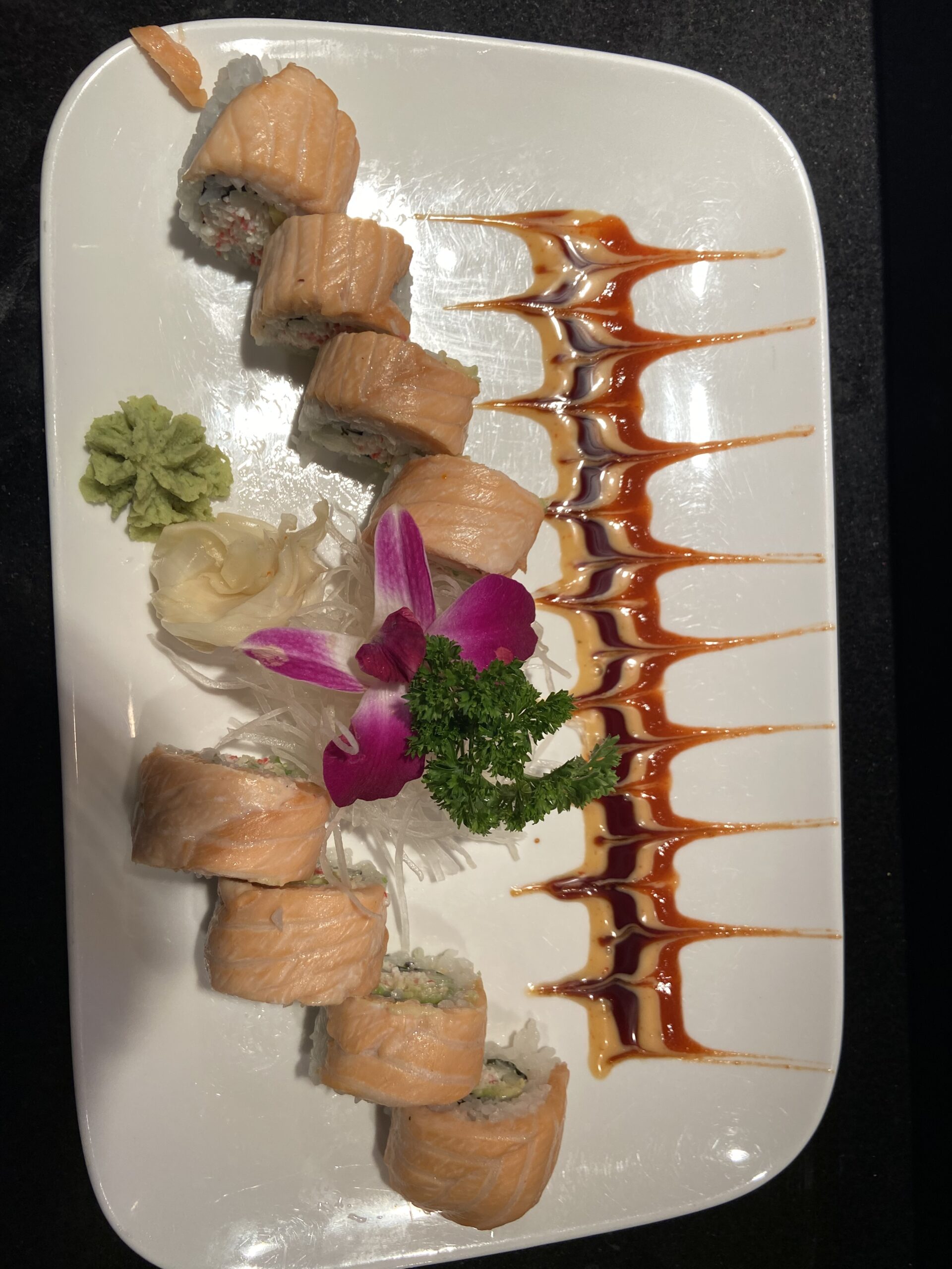 Pressed sushi roll with crab meat, crunch flakes topped with seared salmon, seared scallop, thinly sliced serrano peppers, flying fish roe drizzled with spicy mayo and eel sauce.