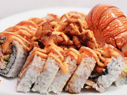 Fried whole lobster tail, avocado, cucumber, masago topped with baked lobster sauce.