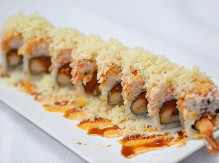 Fried shrimp, avocado, cream cheese topped with spicy crab and crunch flakes.