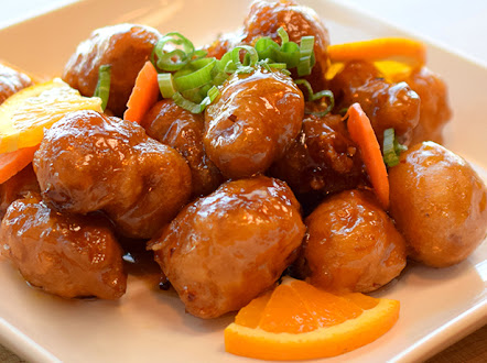 Battered & fried chicken in house made orange sauce, seared broccoli and shredded orange peel.