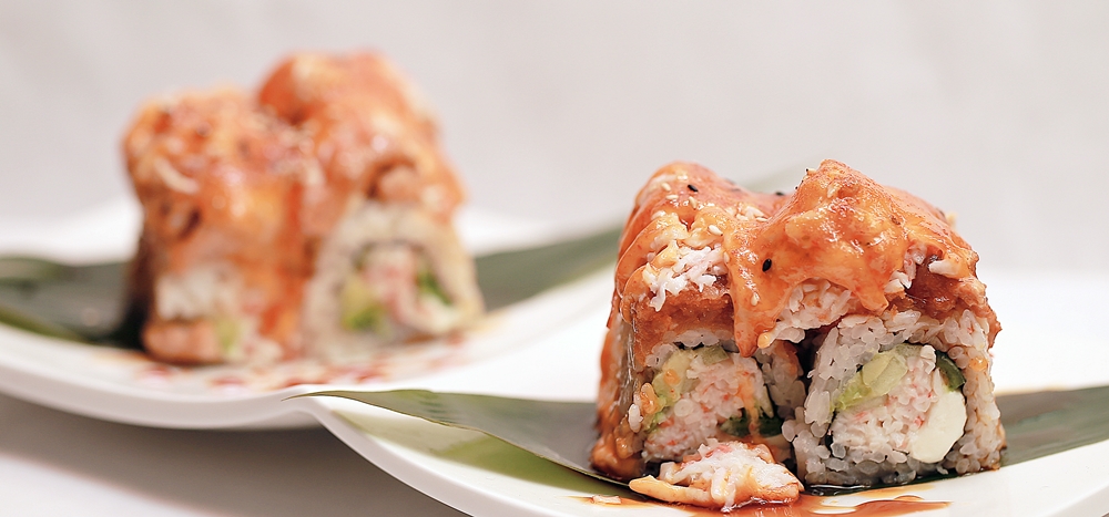 Crab stick, cream cheese, avocado, deep fried topped with fried shrimp, tobiko, scallions, drizzled with spicy mayo and eel sauce.