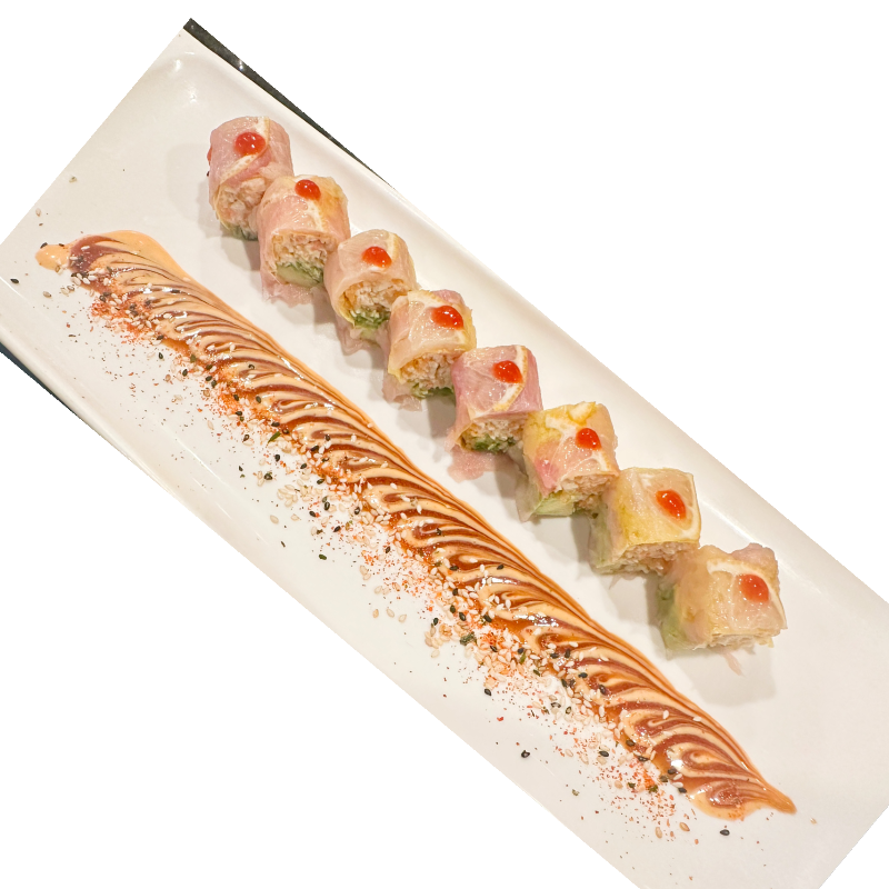 Crab meat, avocado, crunch flakes wrapped with yellowtail topped with chili-sliced lemon and sriracha