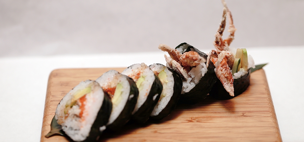 Shrimp tempura, avocado, cucumber, eel sauce.