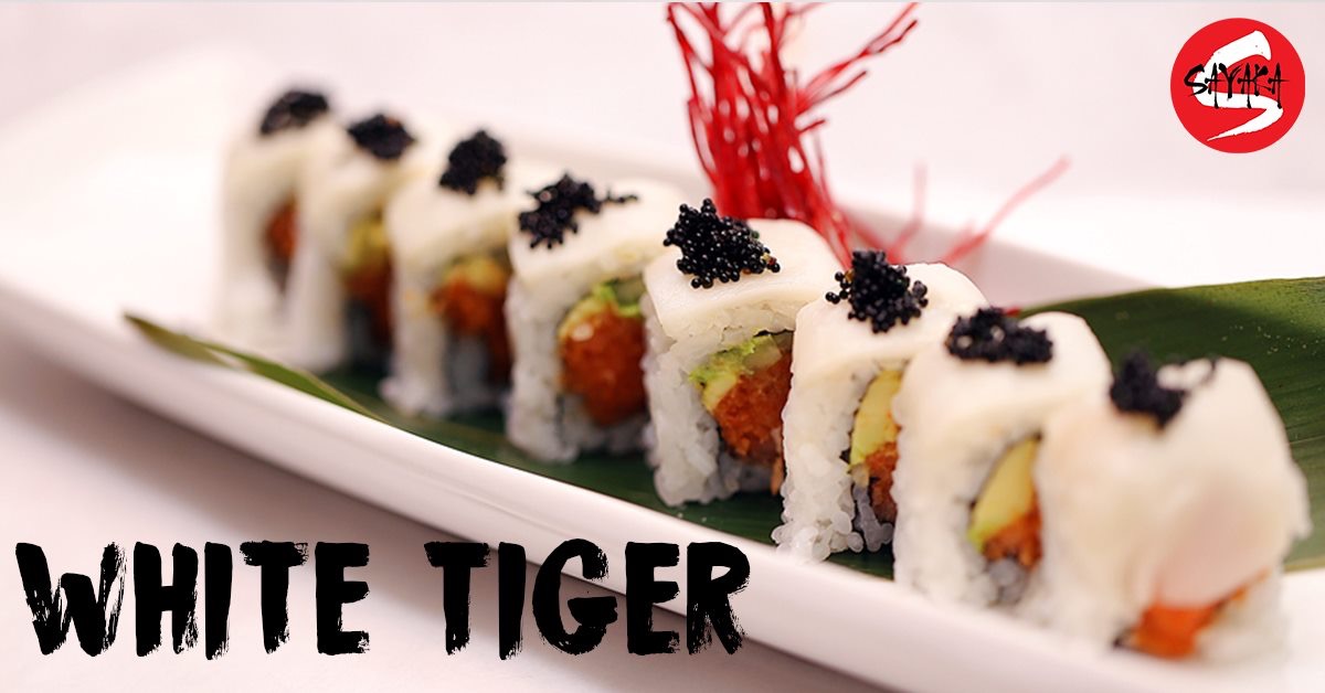 Spicy crab, cucumber, wrapped with white fish, topped with jalapeno, smelt roe and sriracha.